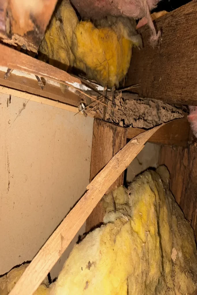 Inside the wall cavity was active termite activity and significant damage to structural studs.
